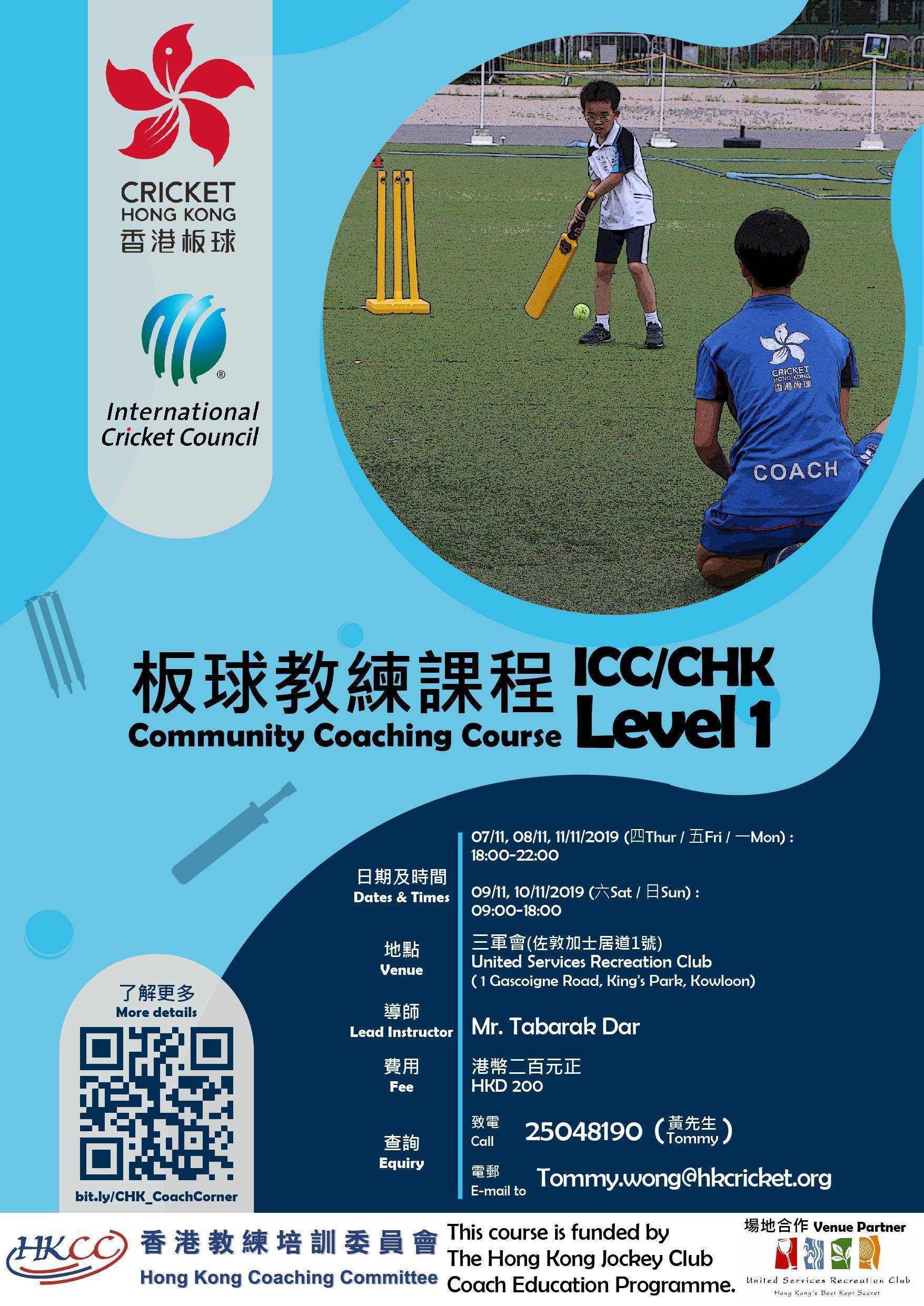國際板球理事會(ICC)及香港板球(CHK)將於2019年11月7日至11日假三軍會(九龍佐敦加士居道1號)舉辦一級(Level 1)板球教練課程,並由ICC認可之導師Mr. Tabarak Dar授教。報名費為港幣200元,名額有限,有興趣報名的,請填妥以下表格,並電郵至 tommy.wong@hkcricket.org