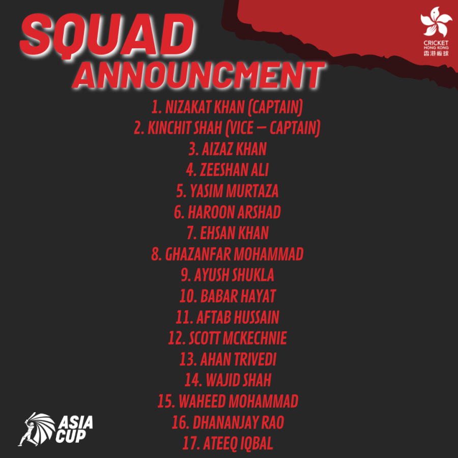 The Hong Kong Men’s squad to compete at the Asian Cricket Council Asia Cup Qualifiers Tournament to be held in Oman from the 20th August - 24th August 2022 has been named.