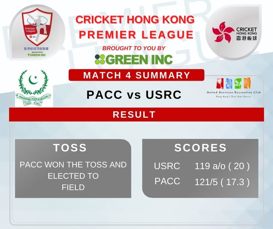 PACC 121/5 in 17.3 overs (Babar Hayat 39, Yasim Murtaza 31 Ali Mohammad 4-0-15-3) beat USRC 119 a/o in 20 overs (Muhamad Umar 25, Tanwir Afzal 4-0-14-2) by 5 wickets