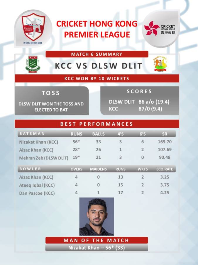 Kowloon Cricket Club (87/0 in 9.4 overs, Nizakat Khan 56*) beat Diasqua Little Sai Wan Cricket Club DLIT (86 a/o in 19.4 overs, Aizaz Khan 2/13, Ateeq Iqbal 2/15, Dan Pascoe 2/17) by 10 wickets