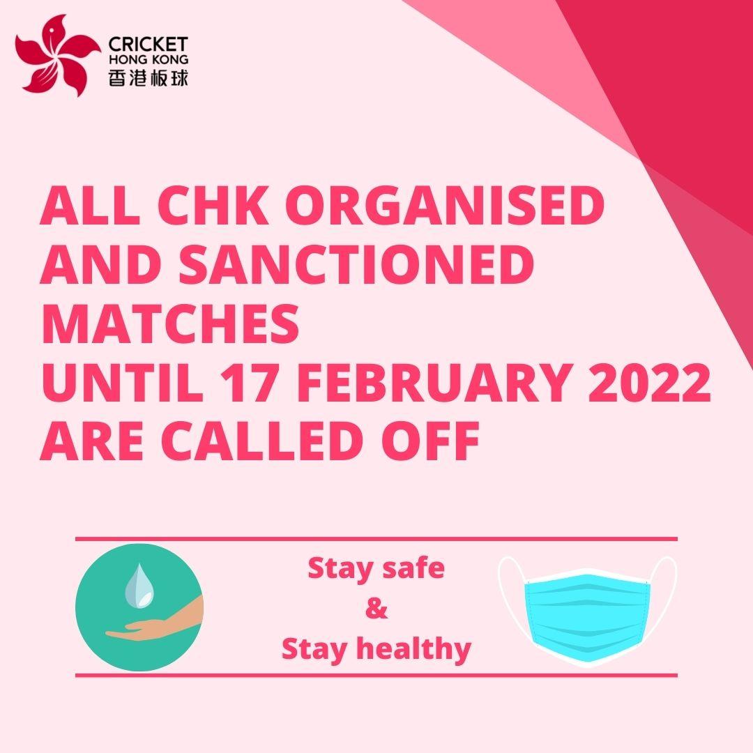 Further to the recent HKSAR government's tightening of social distancing measures (Link 1, Link 2) all cricket matches organised or sanctioned by Cricket Hong Kong will be called off until 17th February 2022. These matches will be considered as Abandoned and points will be shared between both teams.