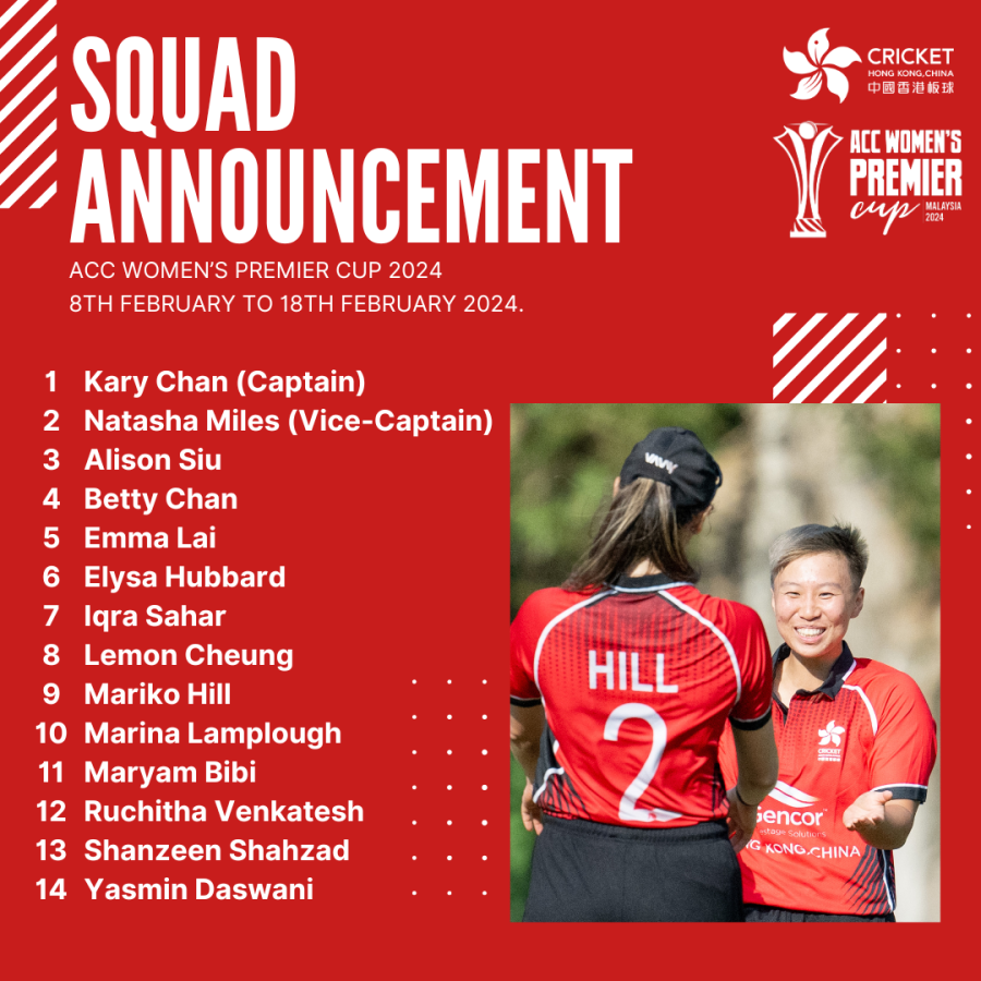 Cricket Hong Kong, China is pleased to announce the 14-player squad to represent Hong Kong, China at the upcoming ACC Women’s Premier Cup, which will be held in Malaysia between 8th February to 18th February 2024.