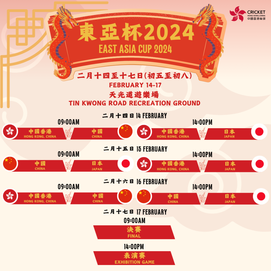 中國香港板球總會宣布2024年男子東亞盃將於2024年2月14日至17日在天光道遊樂場舉行。