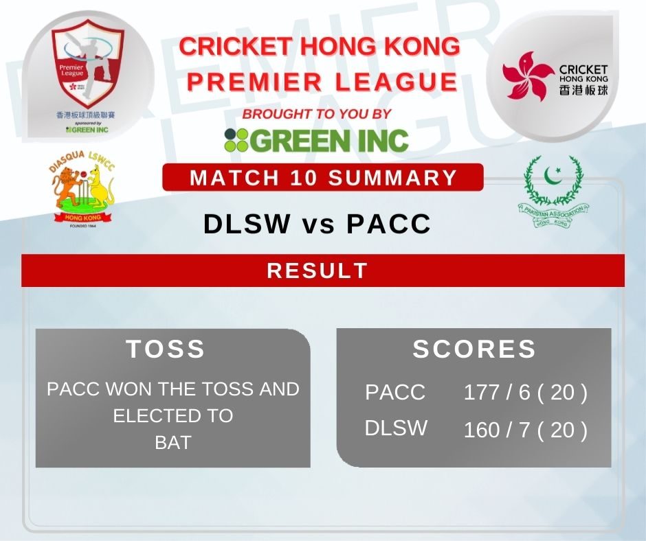 The runchase started decently for DLSW, with a steady 53 run opening partnership between Ibraheem Ishaq and Ikram Hussain. However, with 12 overs to go DLSW still needed a further 147 runs – a RRR of 12.25. Legspinner Luke Jones was brought into the attack and struck right away, dismissing Ibraheem 1st ball caught smartly by Ryan Buckley down at long-off. He repeated this trick in his next over, with Ikram Hussain dismissed in nearly identical fashion, and after 10.1 overs DLSWCC were 74/2. Waqas Khan was joined by Ehsan Khan in the middle, and after a quiet 11th over, Ehsan exploded, hitting Jones for 4 sixes and a boundary in the 12th over, taking 30 off it! That huge over propelled DLSW 114/2 in 13 overs, leaving them with 86 to win from 42 balls with two of their best batsmen at the crease. Unfortunately for DLSW, Ehsan was dismissed 1st ball of the 13th, caught well at long-off by Haroon Arshad off the bowling of Martin Versfeld. Waqas Khan hit a four and a six later that over, and managed to clear the ropes in the 14th and 15th over as well, but HKCC kept striking back, taking the wickets of Mehran Zeb and Upul Rupasinghe. Aftab Hussain walked out to bat in the 16th and hit a couple of clean sixes in the next two overs, which meant that DLSW were still in the game at the start of the 18th. They needed 33 to win off the last 12 balls, with Waqas Khan batting on 52* off 26, and Aftab Hussain 17* off 7. Charlie Wallis – who had bowled impressively all day – was entrusted with this important over and delivered, dismissing Aftab first ball, caught well at point by Kinchit Shah. Martin Coetzee then made his presence felt one last time, with a sharp bit of fielding to run-out Waqas Khan 2 balls later, essentially sealing the game for the hosts. The DLSW lower order tired their best, but ultimately the visitors fell short of their target by 17 runs. HKCC emerging winners of Game 1 of the CHK PLT20!