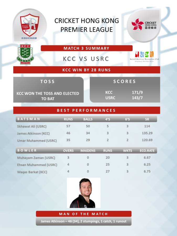 Kowloon Cricket Club (171/9 in 20 overs, Jamie Atkinson 46, Muhayam Zaman 3/20, Ehsan Muhammad 3/25) beat United Services Recreation Club (143/7 in 20 overs, Ali Skhawat 57, Waqas Barkat 3/27) by 28 runs