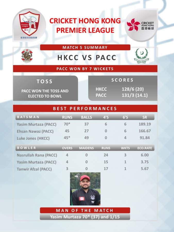 Pakistan Association Cricket Club (131/3 in 14.1 overs, Yasim Murtaza 70*, Ehsan Nawaz 45) beat Hong Kong Cricket Club (128/6 in 20 overs, Luke Jones 45, Nasrullah Rana 3/24) by 28 runs