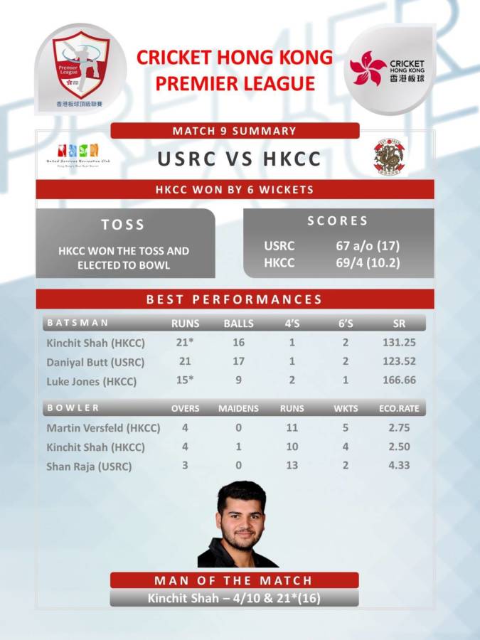 Kinchit Shah delivered with both bat and ball, while Martin Versfeld took the first five-wicket haul of the competition, as the Hong Kong Cricket Club ended their campaign with a resounding 6 wicket victory over USRC. Electing to field first, the hosts bowled out USRC for just 67 -their lowest score of the competition so far- before chasing it down in under 11 overs, albeit with a bit of a top-order wobble. This takes them to 2 wins out of their 4 games, and a third-place finish in the points table, while USRC end their first ever Premier League competition without a win.