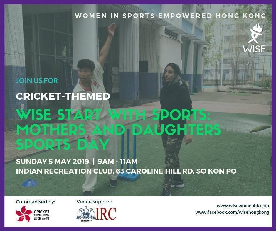 a co-host event between Cricket Hong Kong and WISE Hong Kong, we are having another “Mother and Daughters Sporrs Day” on the 5th May 2019, from 0900 - 1100 at Indian Recreation Club.