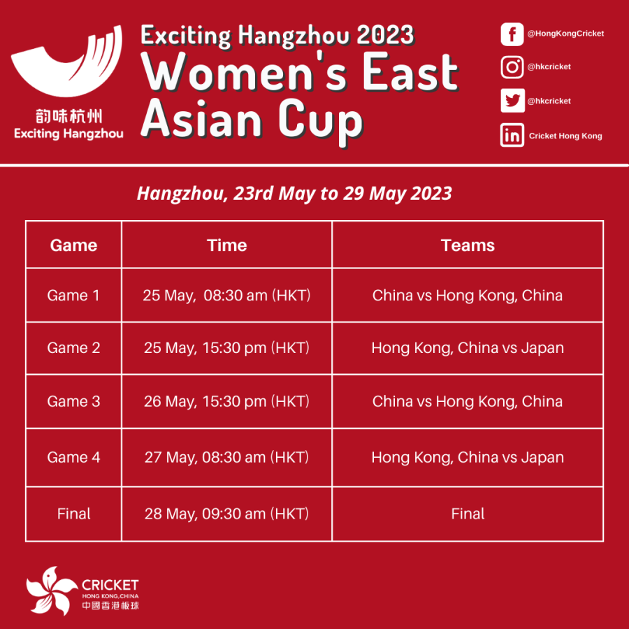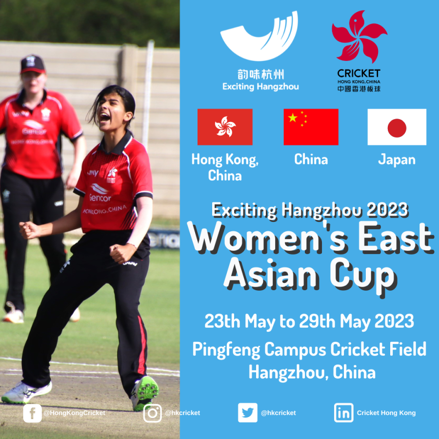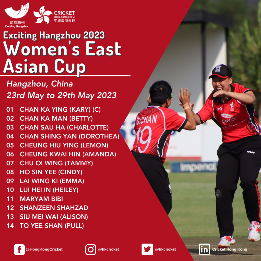 中國香港板球公佈出戰「韵味杭州」女子板球東亞盃14人大軍名單,比賽將於五月二十三至二十九日在杭州舉行,本屆東亞盃由中國、日本和中國香港競逐。